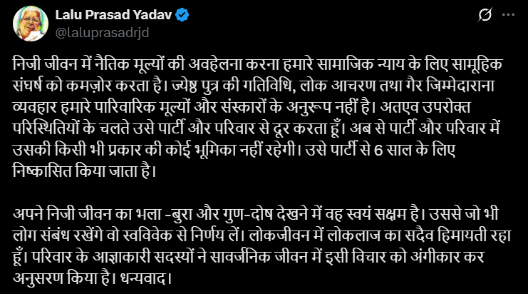 RJD प्रमुख लालू प्रसाद यादव ने बिहार चुनाव के बीच बहुत बड़ा और महत्वपूर्ण फैंसला लिया है 25 मई को उन्होंने अपने Twitter Handle से Twitte करते वक्त लिखा है के वो अपने बड़े बेटे तेजप्रताप यादव को घर और पार्टी दोनों से ही निकाल दिया है हालांकि पार्टी से केवल 6 वर्षों के लिये निकाल है |