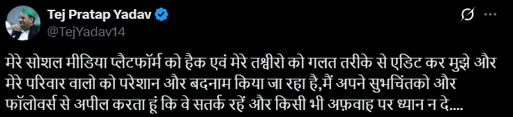 बताया जा रहा है की शनिवार तेजप्रत्यप के सोशल मीडिया प्लेटफॉर्म से जो एक तस्वीर वायरल हो रही है उसकी वजह से ये सर मामला गरमाया है क्युकी जो तस्वीर वायरल हो रही है उस तस्वीर में तेजप्रताप यादव के साथ एक लड़की नज़र आ रही है ,और इतना ही नहीं बल्कि साथ ही ये बात भी फैली हुई है की तेजप्रताप यादव उसी लड़की के साथ बिहार के 2025 के चुनावों से पहले ही दूसरी शादी करने वाले है | हालांकि हम इस बात की पुष्टि पूरी तरह से नहीं करते हैं ,क्यूंकी कल यानि शनिवार के दिन ही जब तेजप्रताप की तस्वीर उस लड़की के साथ वायरल हुई तो उन्होंने TWITTE करते हुए लिखा की –